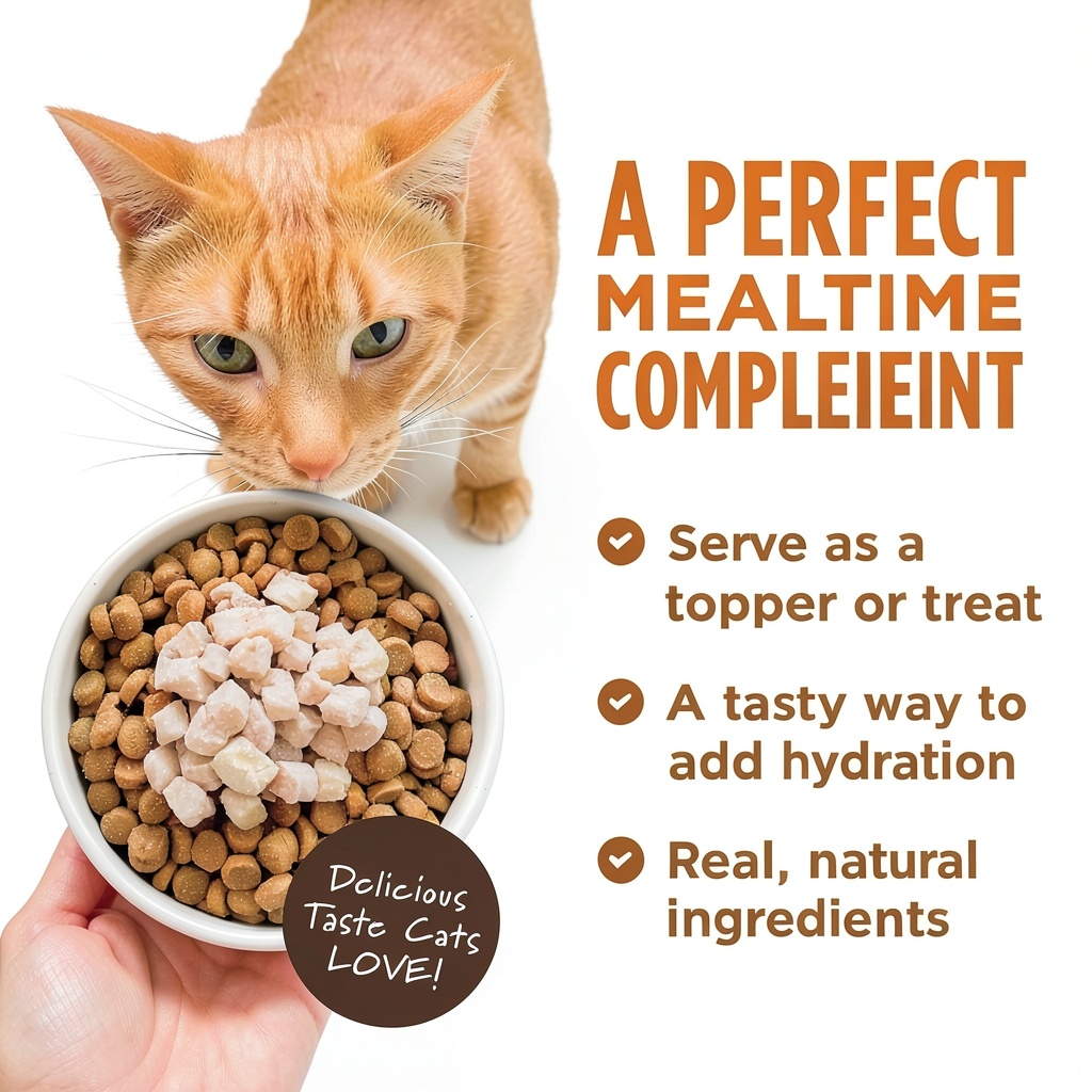 This cat food topper is ideal for daily use as a treat, mixer, or topper to add flavor, moisture, and variety to your cat’s meals. It is especially beneficial for picky eaters who may be hesitant with standard dry or wet foods, making it perfect for households seeking to improve their cat’s nutrition and enjoyment. Use it in environments like homes with multiple cats or for cats with specific dietary needs, providing supplemental nutrition that supports overall health and vitality.
