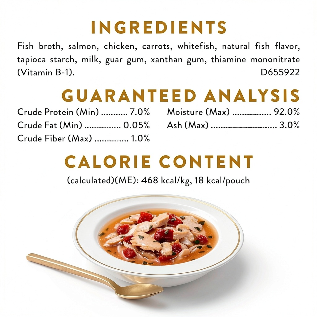 Purina Fancy Feast gourmet cat food topper is a tender, high-protein treat crafted with real salmon and whitefish in a silky, decadent broth. This grain-free wet cat food topper contains no by-products, fillers, artificial flavors, colors, or preservatives, ensuring a wholesome addition to your cat’s diet. Product dimensions are 6.4 x 5.9 x 3.9 inches, with an item weight of 1.41 pounds, manufactured by Nestle Purina Pet. It boasts a high customer rating and is designed for easy, convenient use in perfectly sized pouches.