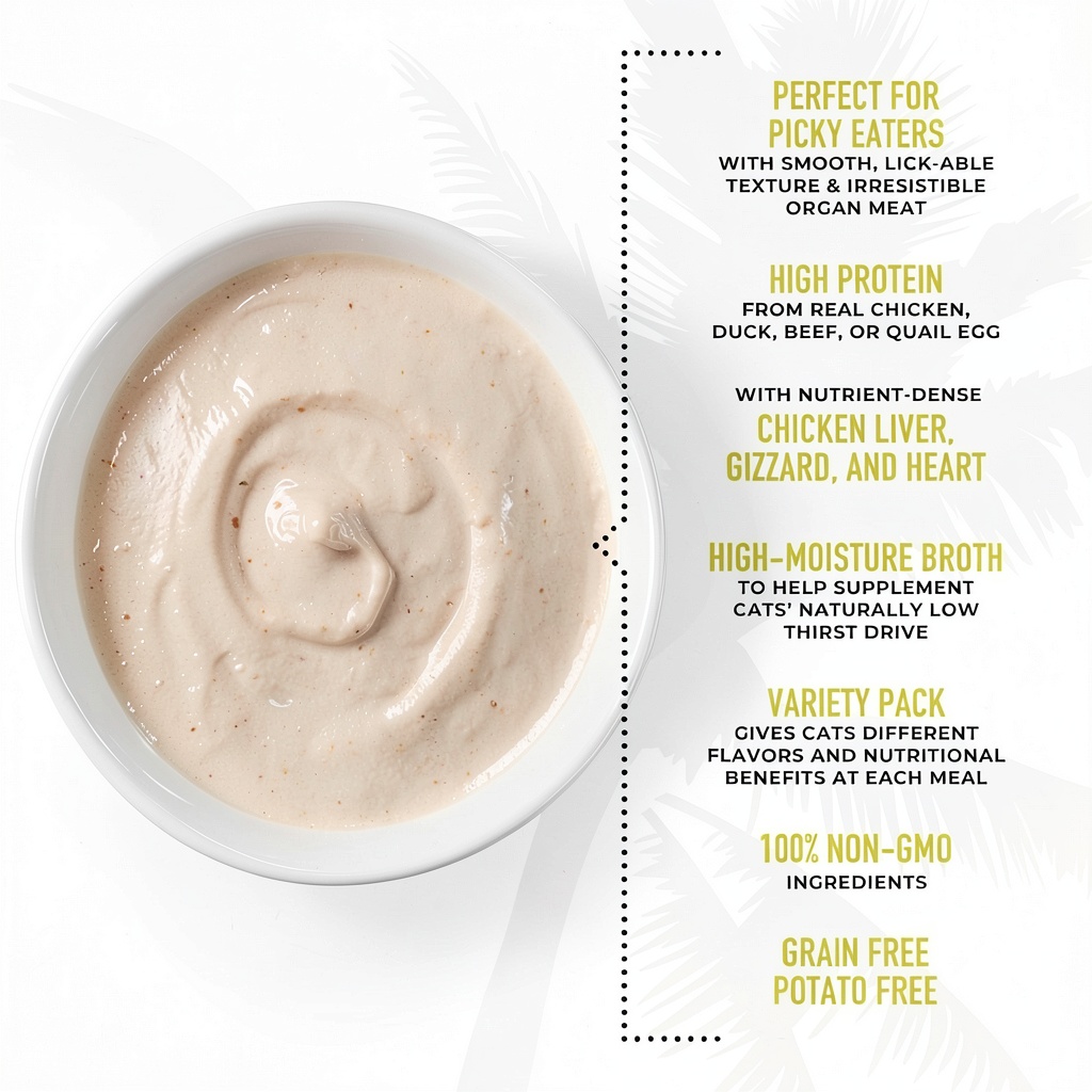Tiki Pets stands out for its commitment to quality and feline health, using 100% non-GMO ingredients and avoiding grains and potatoes to cater to sensitive stomachs and dietary restrictions. The inclusion of real organ meats and high-protein sources ensures superior nutrition and taste, backed by positive customer reviews and a high best-seller rank. Our focus on palatability and hydration addresses common feline issues, providing a reliable solution that promotes overall well-being and satisfaction for both cats and their owners.