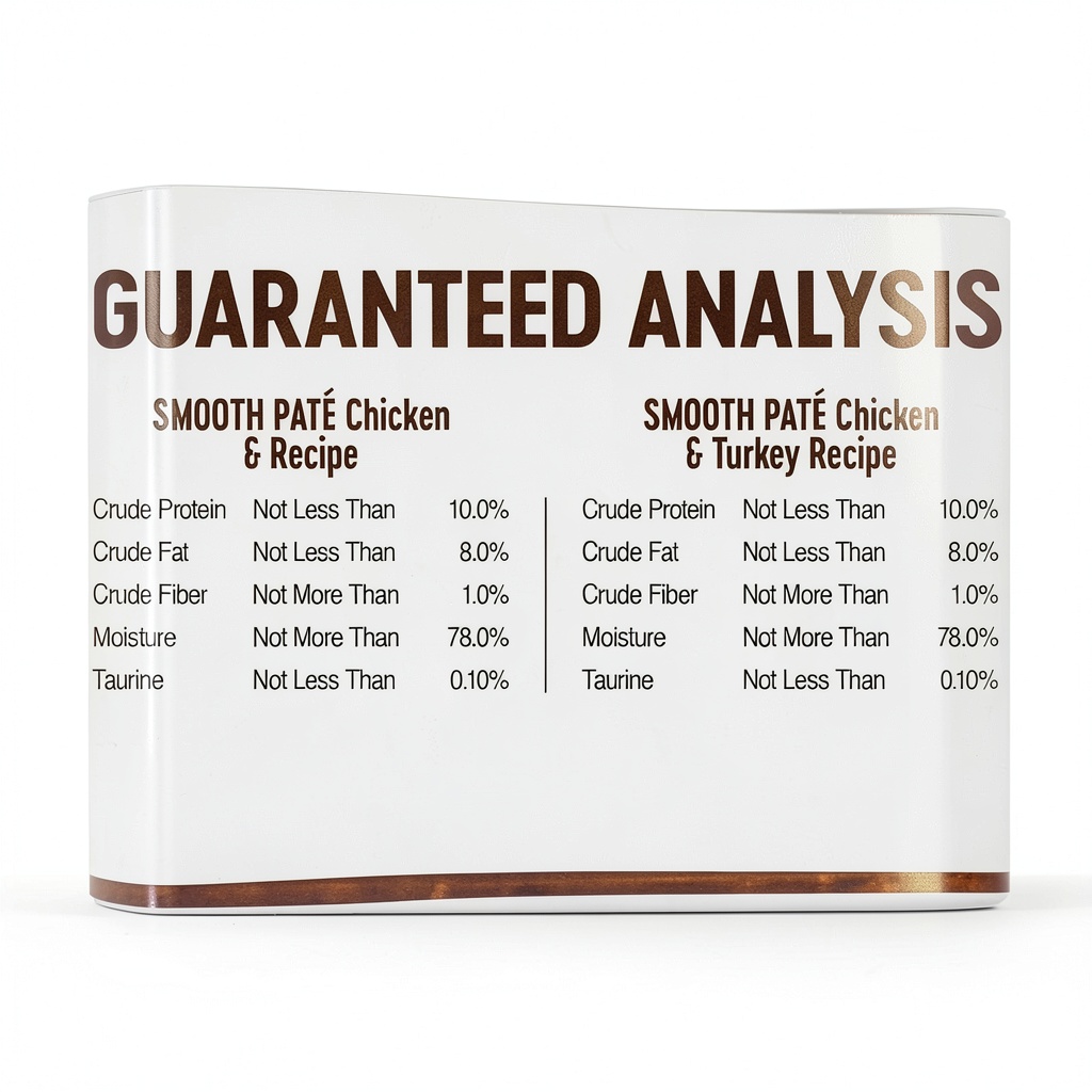 The variety packs include options like Chicken Pate and Turkey Pate in the Poultry pack, with other packs featuring seafood or land pate varieties, all made with real protein.